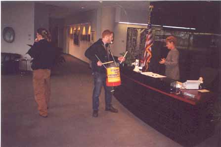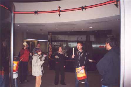 Strikers from Jefferson demonstrated today at the house Jones occupies in Westport. In a solidarity action, the University of Wisconsin Student Labor Action Coalition also demonstrated at Rayovac headquarters in Madison.