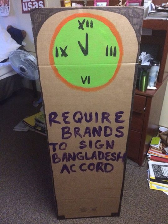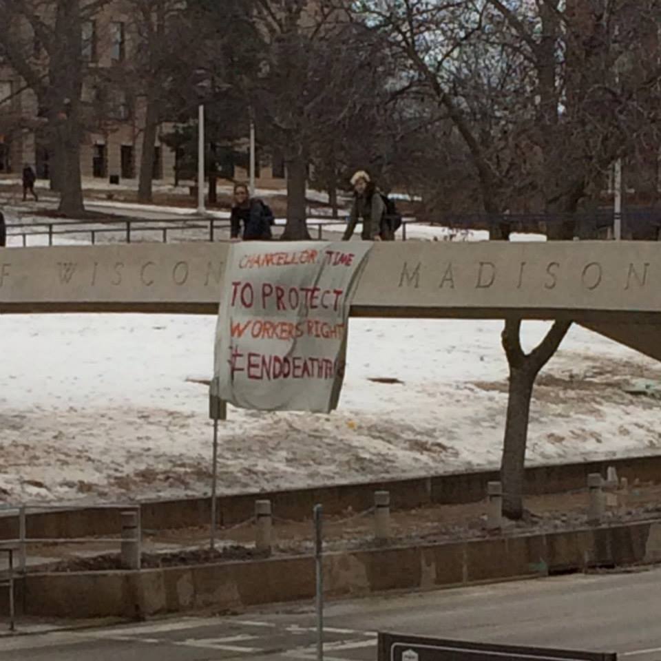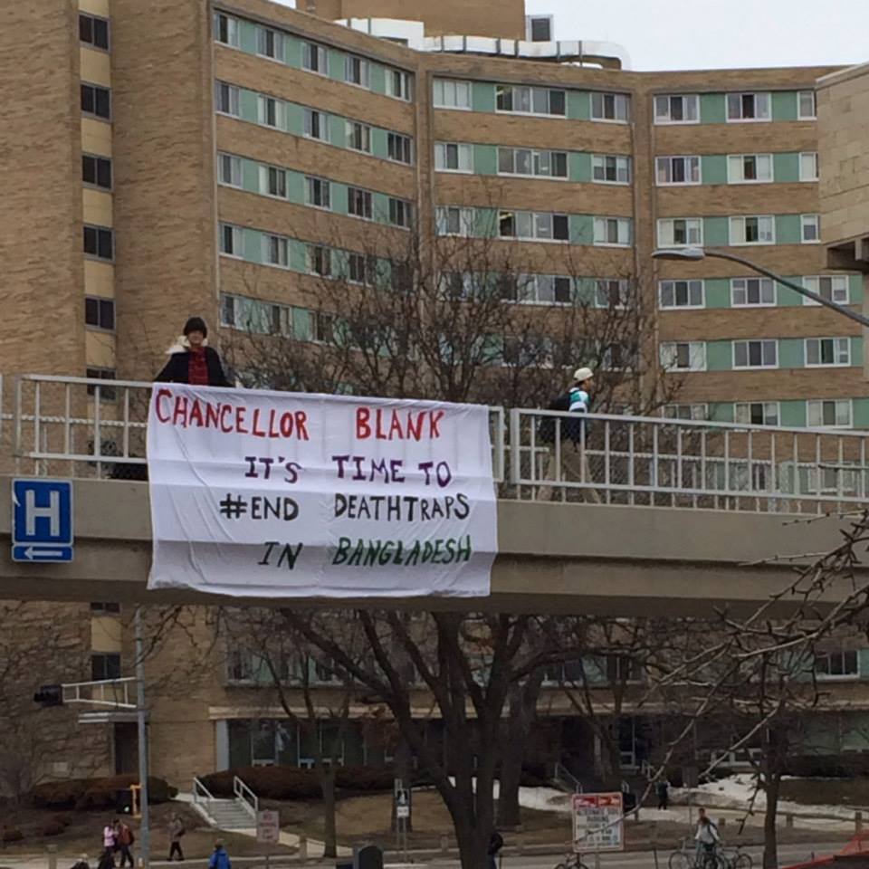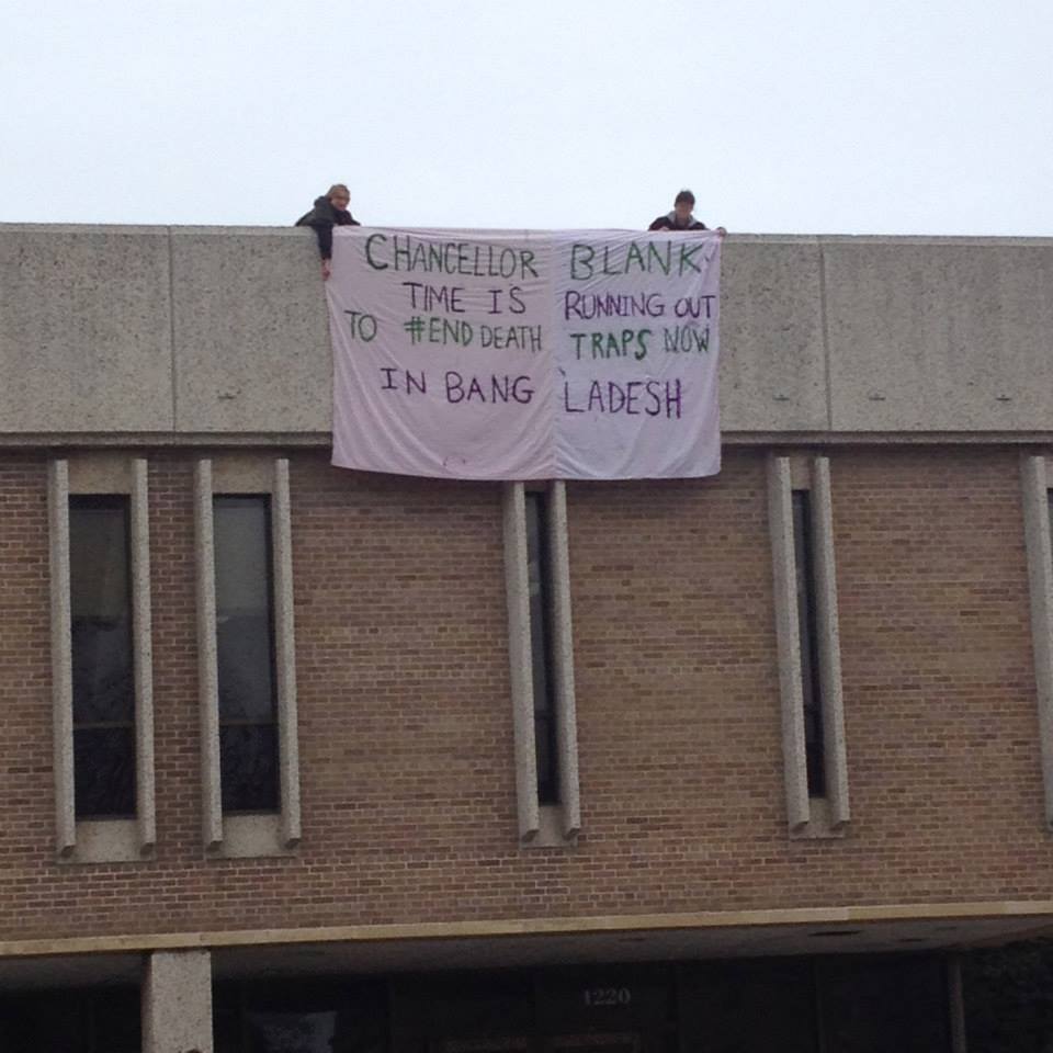 Members of University of Wisconsin-Madison’s Student Labor Action Coalition displayed banners on U-W Madison bridges and buildings and delivered a cardboard replica of a clock tower to Chancellor Rebecca Blank on March 11, 2014 , urging her to sign an agreement on behalf of UW-Madison that would protect Bangladeshi garment workers’ rights.