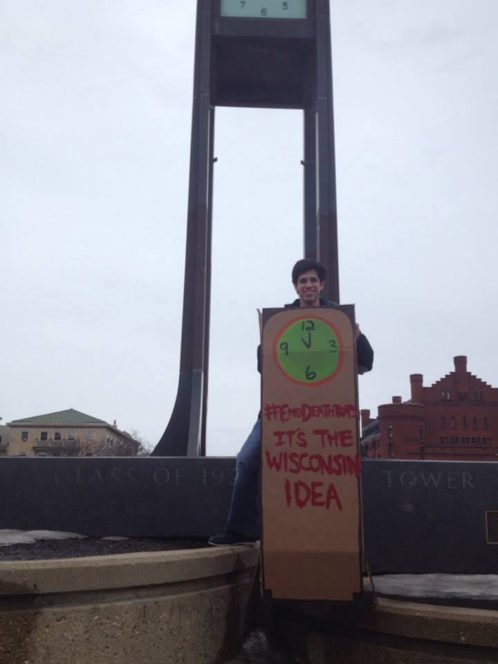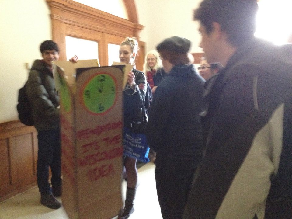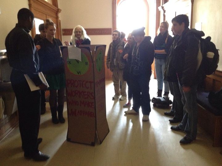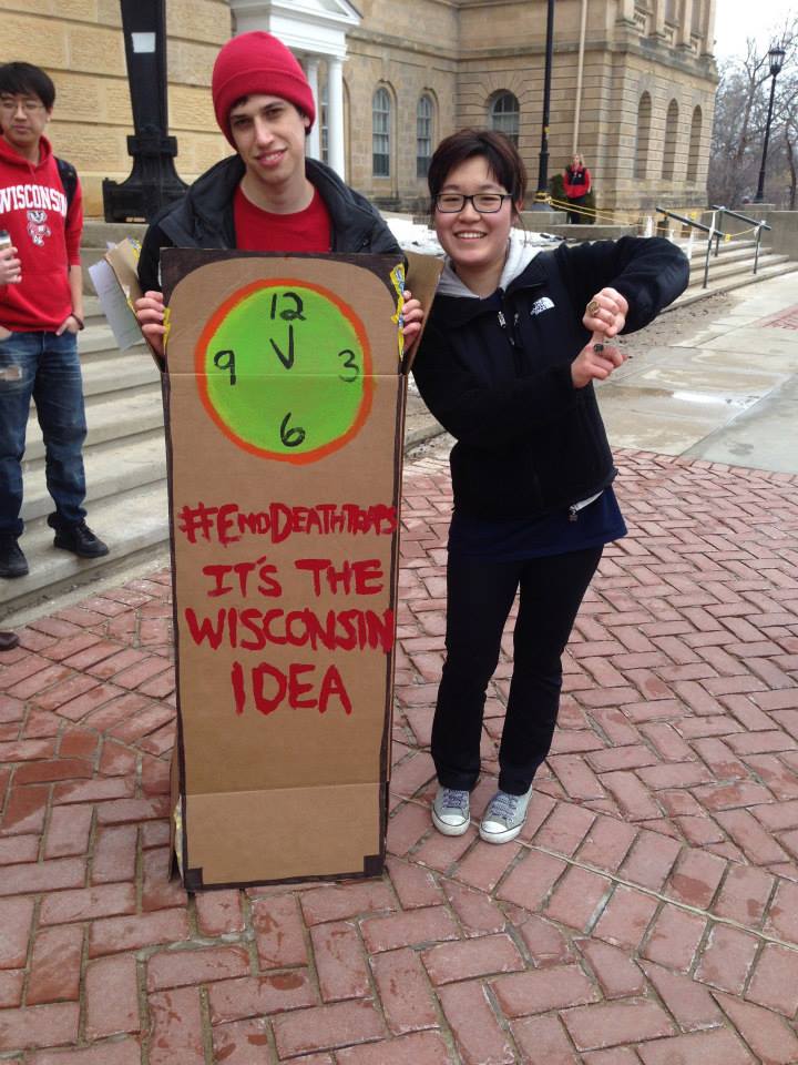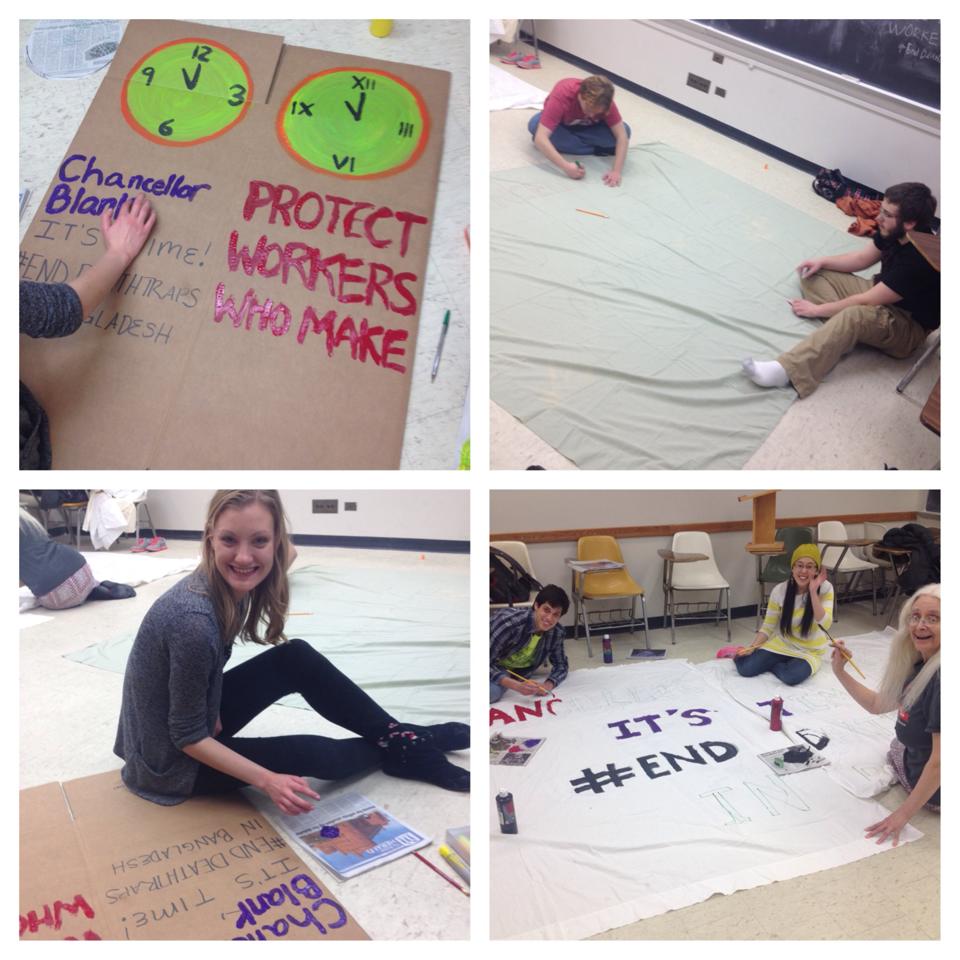 Members of University of Wisconsin-Madison’s Student Labor Action Coalition displayed banners on U-W Madison bridges and buildings and delivered a cardboard replica of a clock tower to Chancellor Rebecca Blank on March 11, 2014 , urging her to sign an agreement on behalf of UW-Madison that would protect Bangladeshi garment workers’ rights.