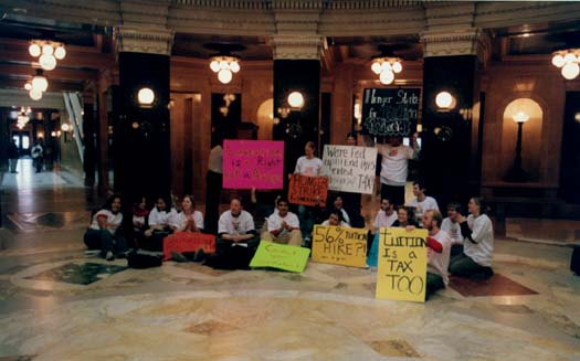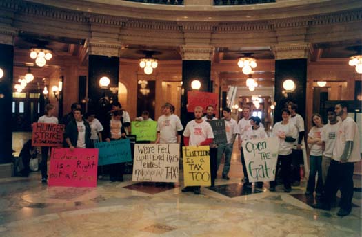 Over 50 students, TA's, and academic staff from UW-Madison, UW-Eau Claire, and UW-LaCrosse began a three-day hunger strike Monday at 10:00 am to demand rollback tuition 37.5% ($1,400) to the level it was two years ago rather than hike it another 14% (almost $1,000) as Gov. Doyle has proposed. At Madison, another 12 students have joined the hunger strike after it started. So far it's been very successful, getting a lot of media attention, having spoken with many legislators who see us in the Capitol, and getting the very vocal support of Al Sharpton.