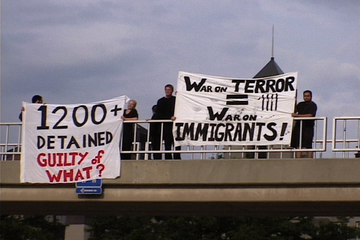 detained - guilty of what?" and "War on Terror = War on Immigrants".
