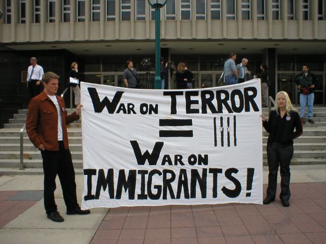 ![[PICTURE - SLAC with banner]](3k2qwdu-thumb.jpg) SLAC members with "War on Terror = War on Immigrants" banner